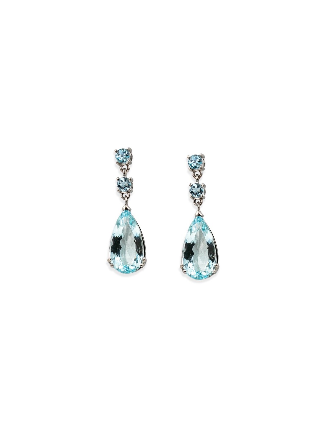 Pendientes realizados de manera artesanal en oro blanco de 18 cts con aguasmarinas naturales. Color natural sin tratar. 4 aguasmarinas en talla brillante con un peso total aprox de 1 cts. más 2 aguamarinas en talla pera con un peso total aprox de 5.30 cts. Peso total 6.76 gr.